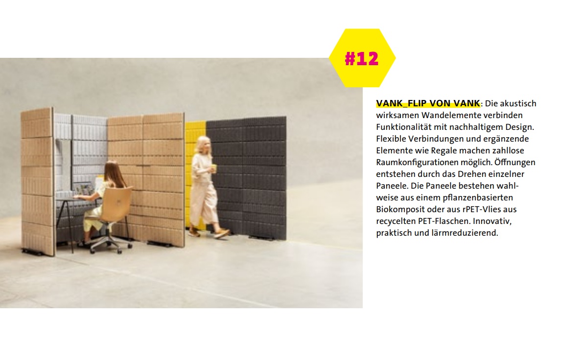 Die Redaktion würdigte das System für die Verbindung von Funktionalität und nachhaltigem Design. Mobile Wände gliedern Open-Space-Flächen ohne bauliche Maßnahmen, und die Paneele bestehen aus einem pflanzenbasierten Biokomposit oder rPET aus recycelten PET-Flaschen. Das bestätigt, dass zirkuläres Design kein Kompromiss zwischen Ästhetik und Umweltverantwortung ist, sondern schlicht gutes Design.