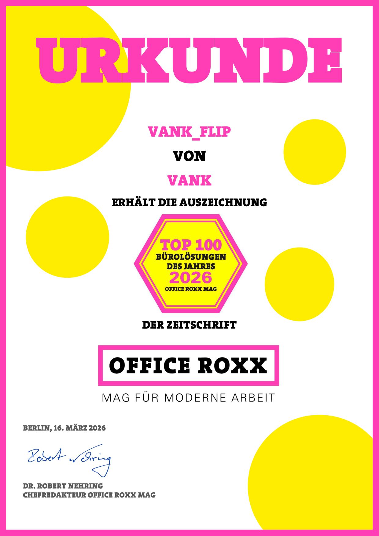 OFFICE ROXX has been publishing the ranking since 2004. In this year’s edition, VANK_FLIP placed among the top twelve out of more than 1,000 products and services evaluated for functionality, design, productivity, and sustainability.