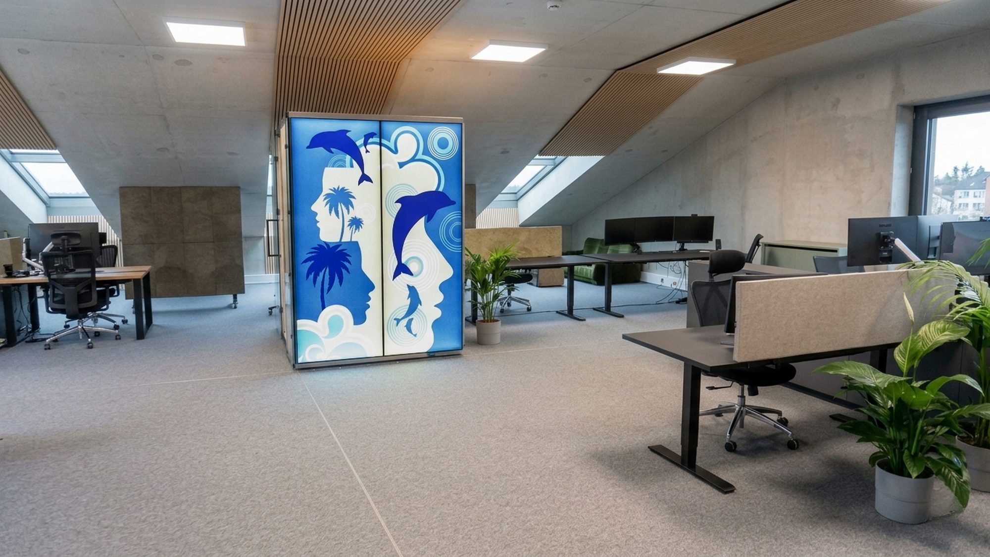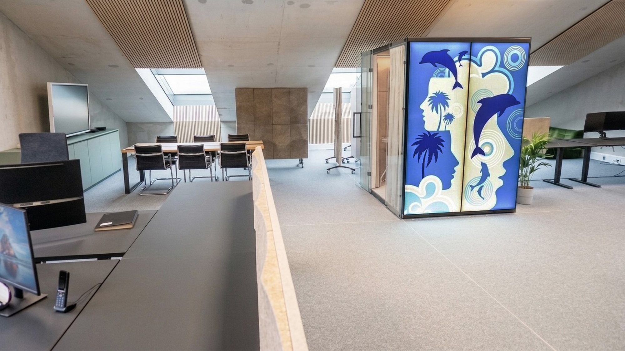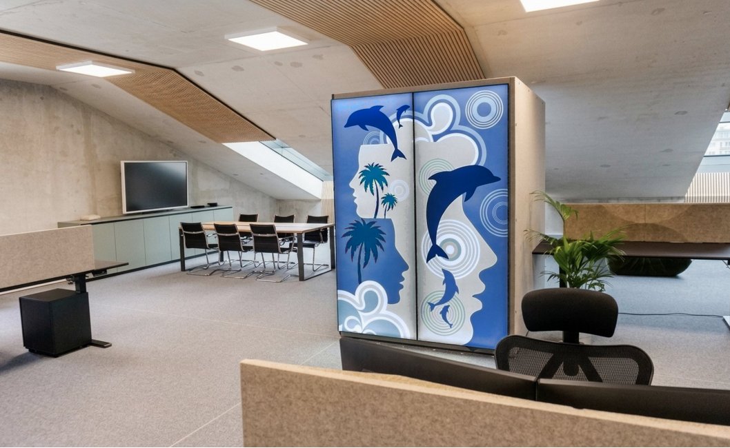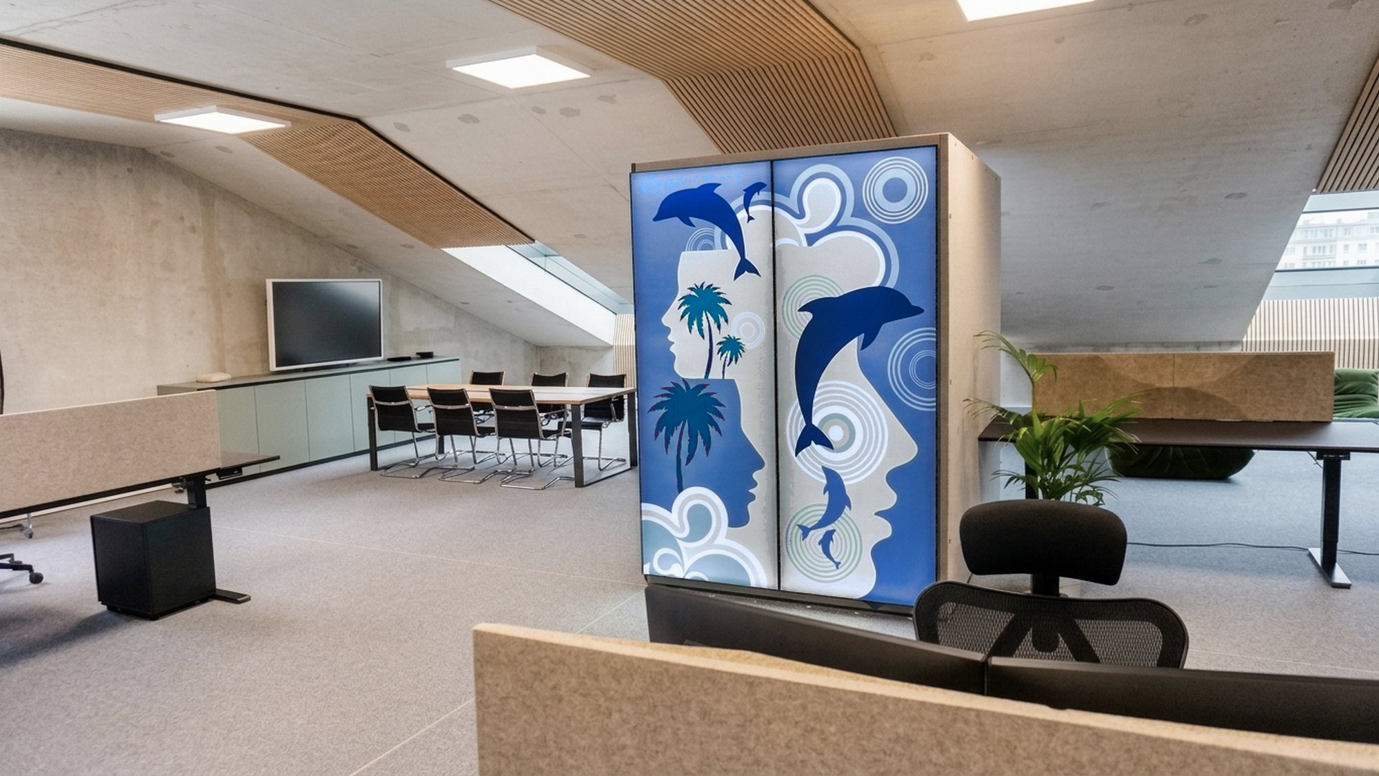 - The central element is a four-person acoustic pod VANK_BOX GRAPHIC LIGHT, designed for calls and small team meetings. It provides acoustic separation without disrupting the openness of the space.