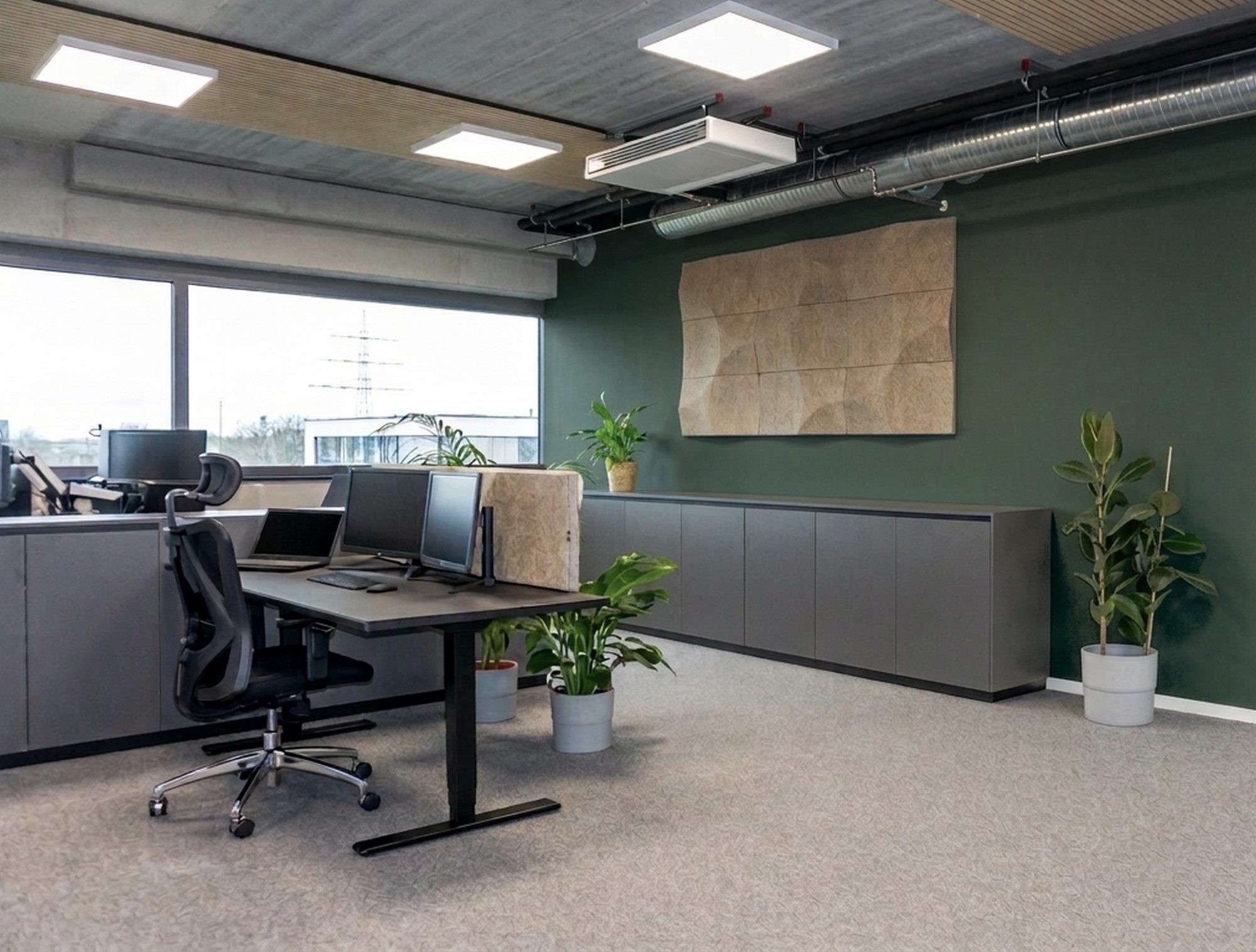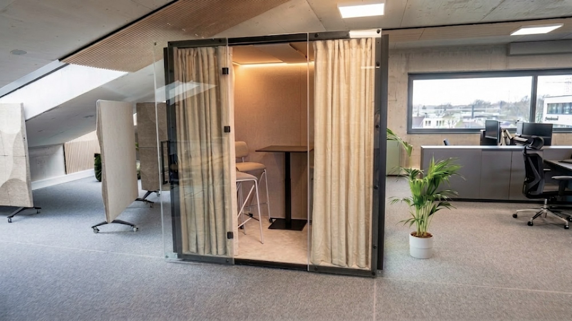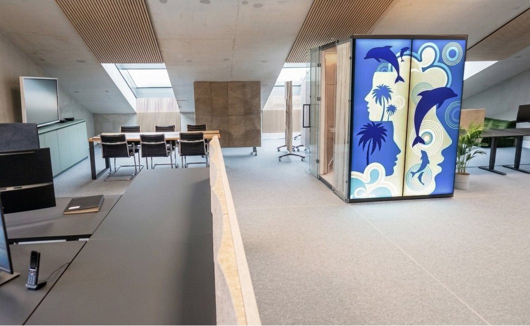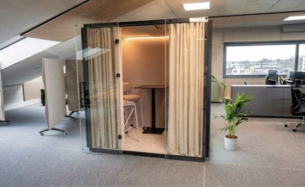 Across the entire project, BIO-based materials create a consistent acoustic layer. Wall panels, desk panels, mobile screens and the pod interior form a unified system that integrates seamlessly with the architecture.
