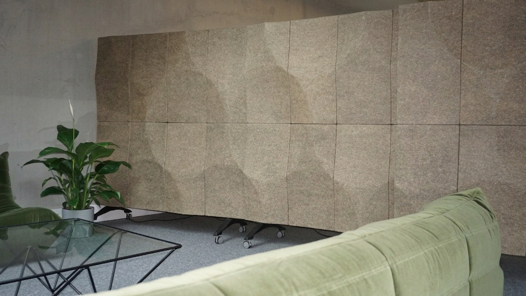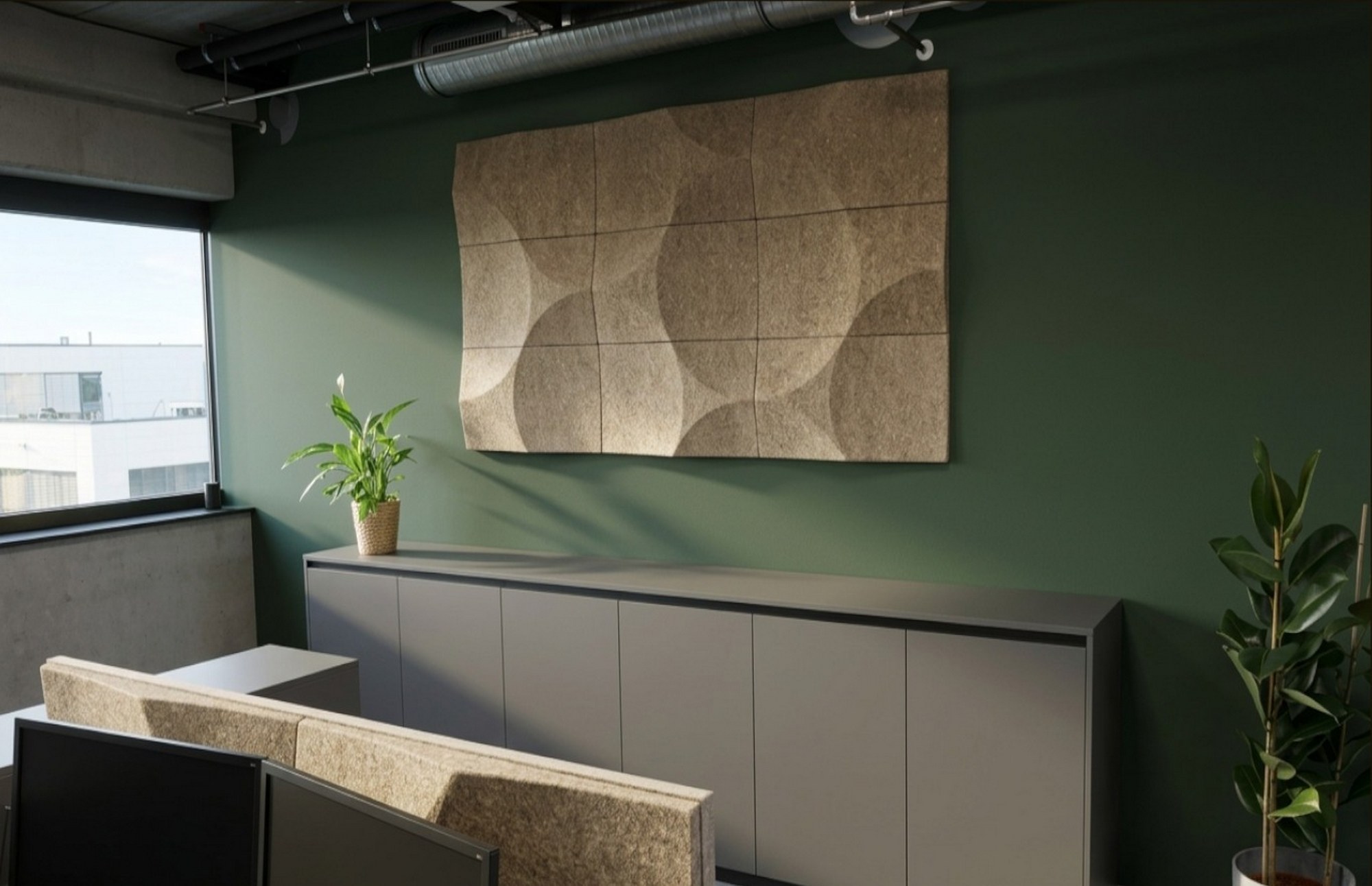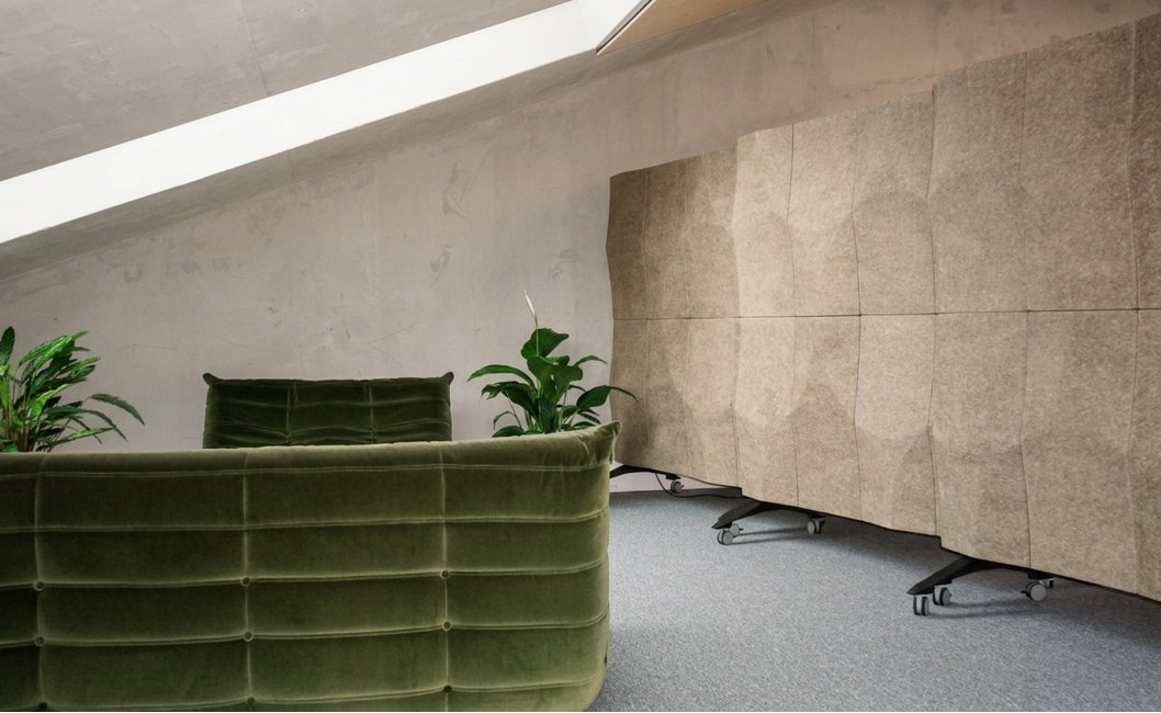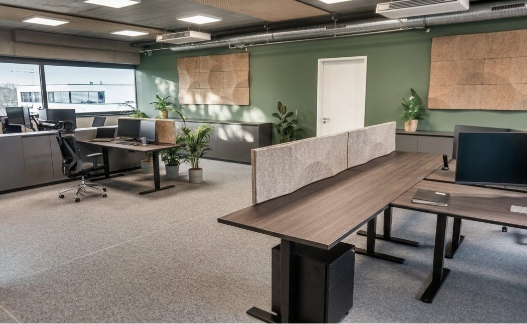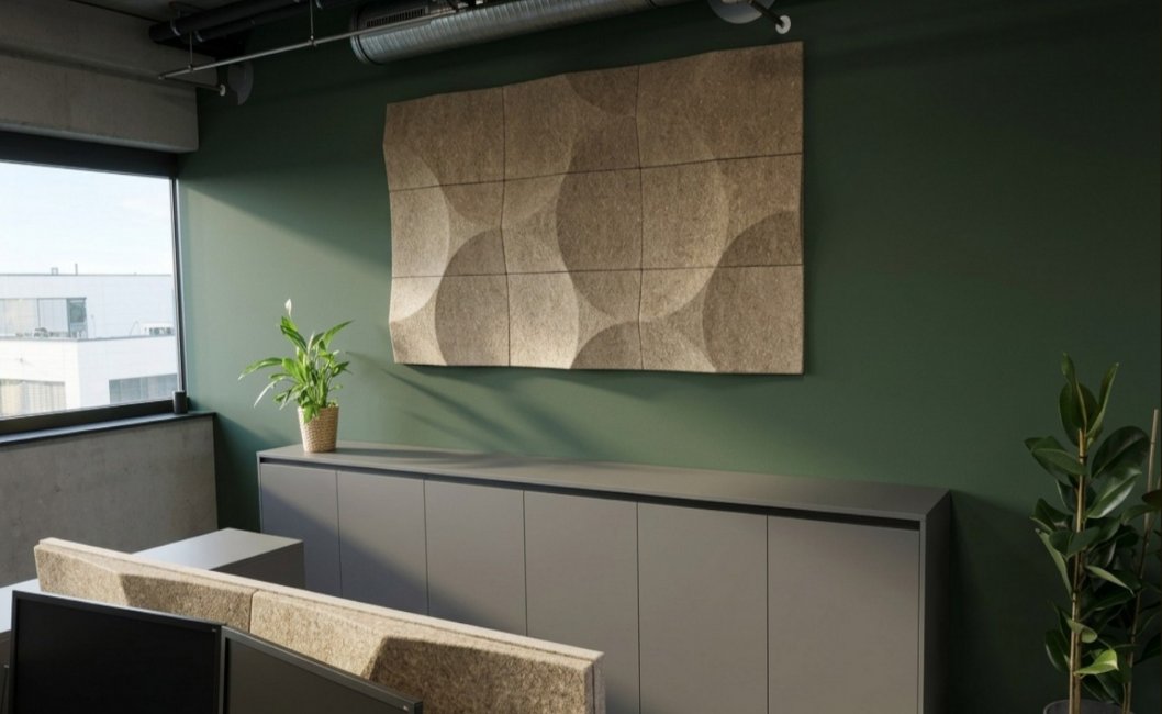 - Wall panels VANK_PANEL ELLIPSE BIO reduce reverberation and limit sound reflections from hard surfaces, stabilising acoustic conditions across the office.