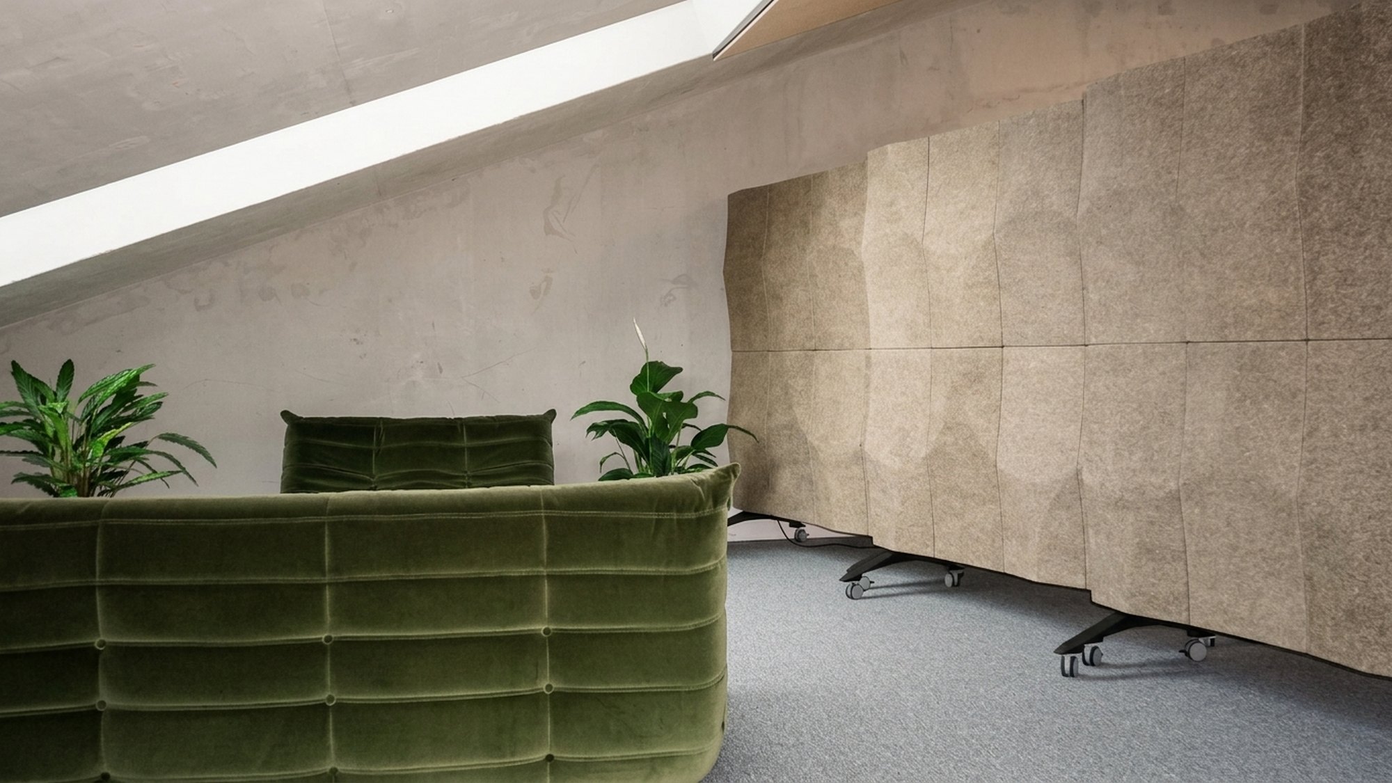 The key challenge was introducing clear functional zones within a single open space. The office needed to support individual work, conversations, meetings and areas for relaxation, without relying on fixed partitions.