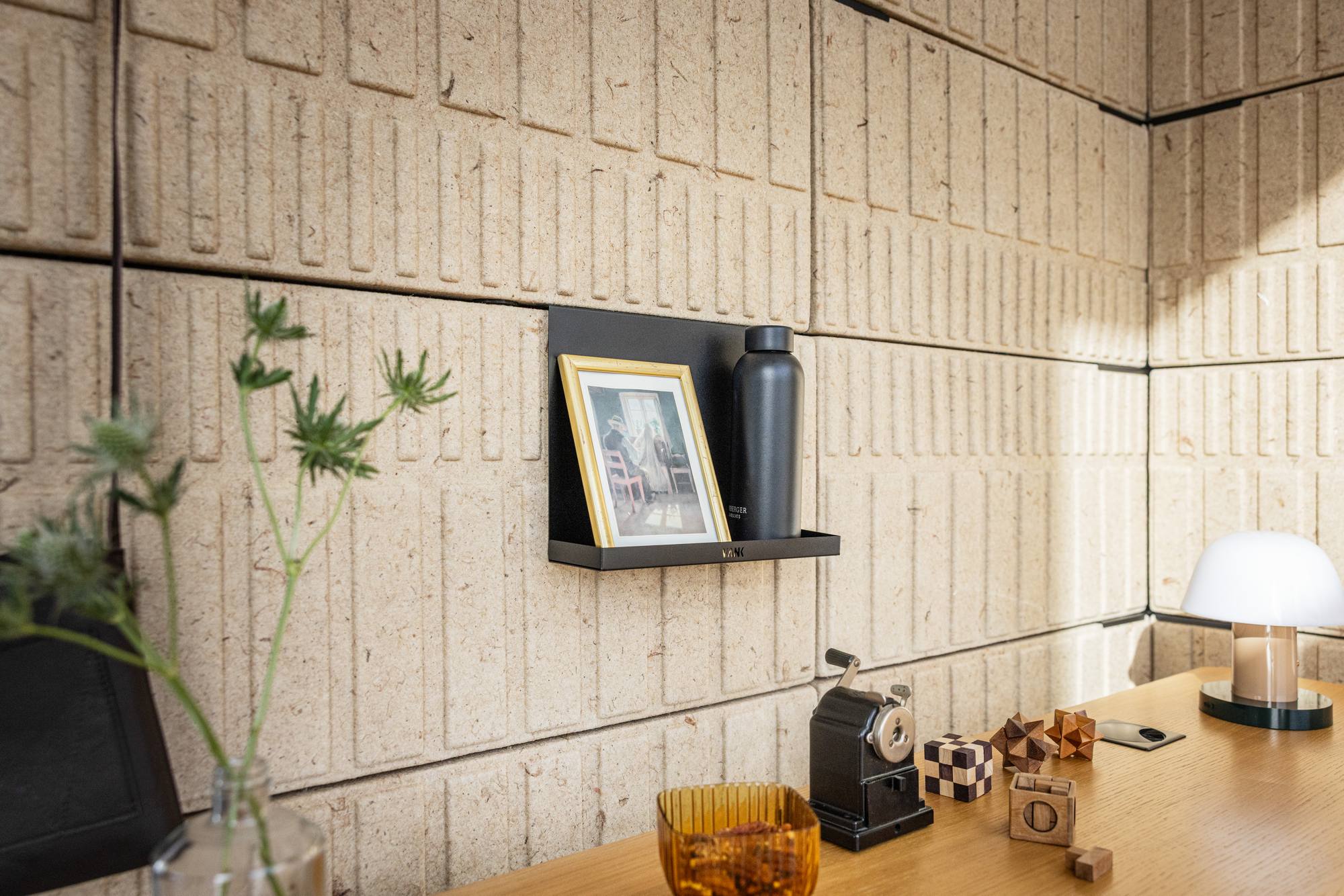 Das charakteristische Merkmal sind die dreidimensionalen BRICKS-Paneele, inspiriert von der Form klassischer Ziegelsteine, die dem Innenraum nicht nur einen starken architektonischen Charakter verleihen, sondern auch hervorragende akustische Eigenschaften (αw = 0,90) bieten. Die Paneele sind in drei Materialvarianten erhältlich: Biokomposit (Flachs und Hanf), recyceltes rPET oder mit Stoff bezogen.