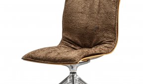The shell made of natural veneer and crafted using the “reduce” technology makes efficient use of wood resources by incorporating shorter veneer fragments. The model is also available with an additional upholstered cushion. The polished four-star aluminum base highlights the lightness of the form and gives the chairs durability suitable for long-term use.