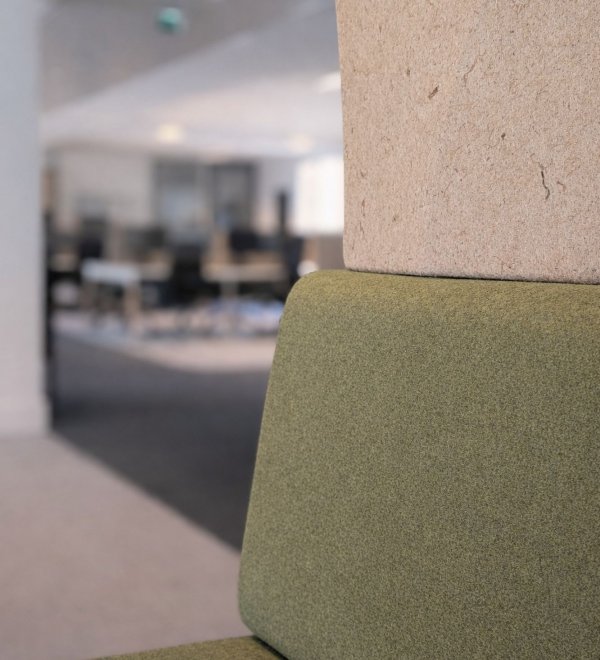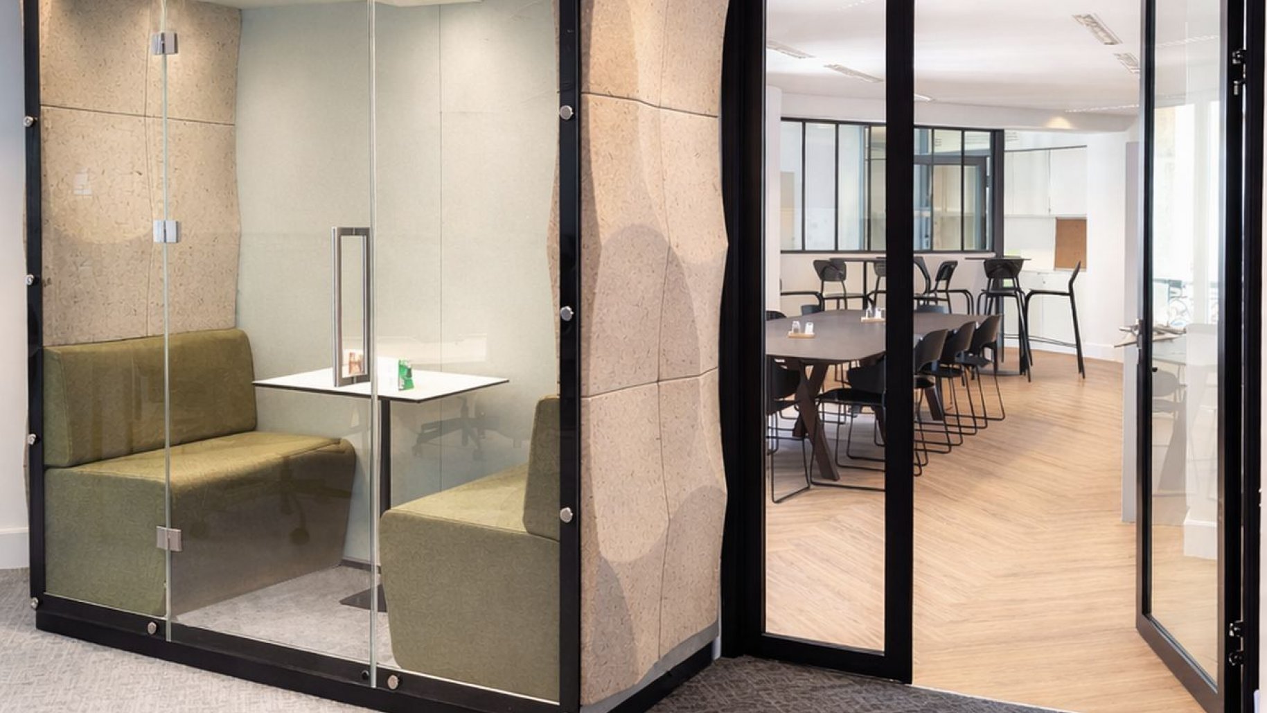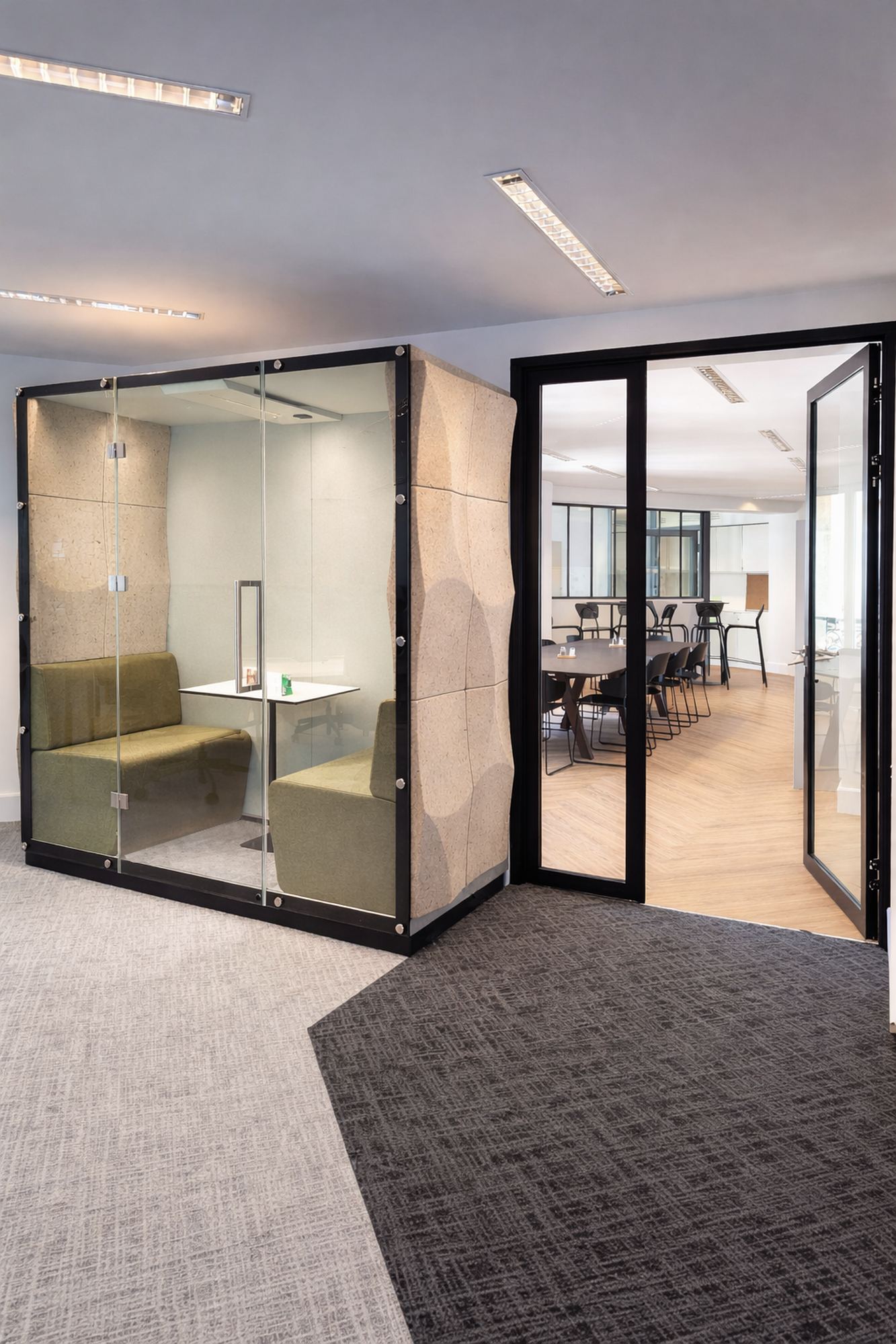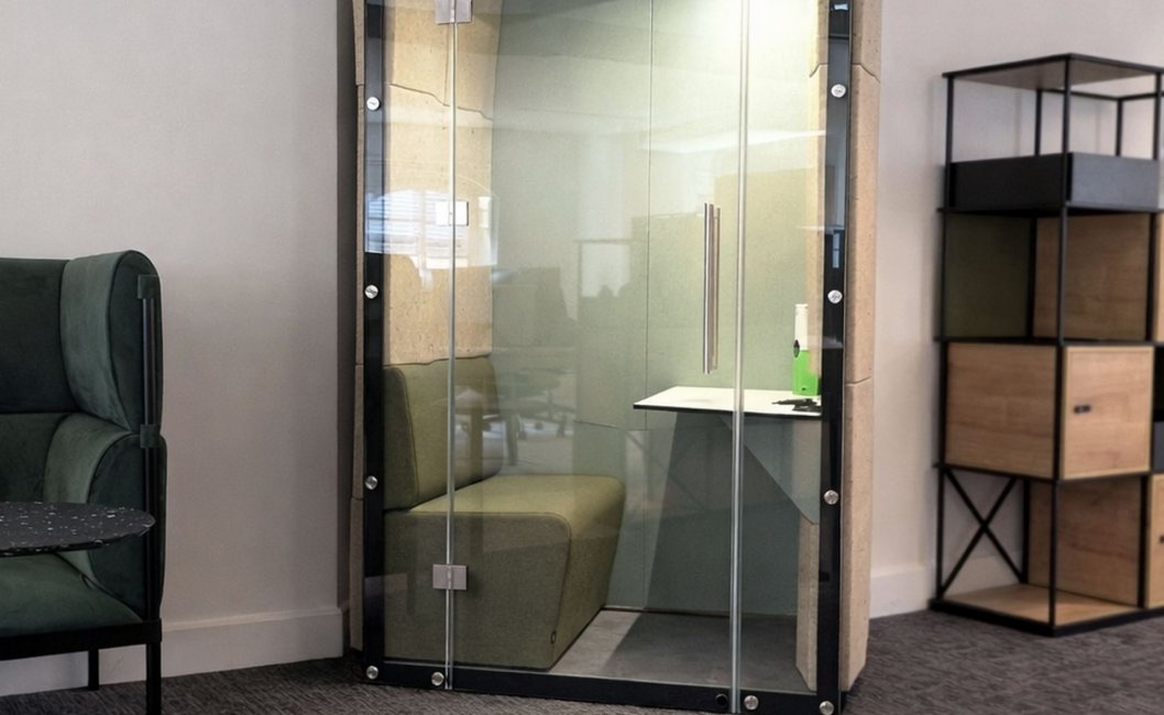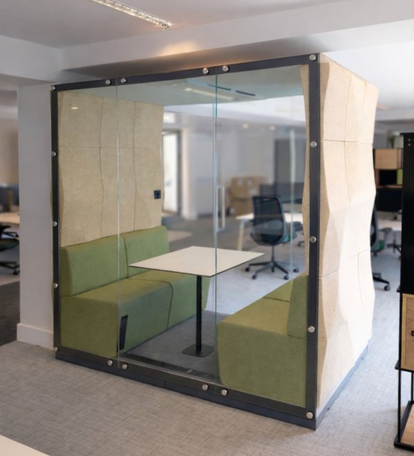 - Design i funkcja: charakterystyczne, eliptyczne kształty paneli ścian zewnętrznych budek nawiązują do kolistych form i idealnie korespondują z miękkim światłem wpadającym przez łukowe okna, tworząc w biurze intymne „wyspy ciszy”.