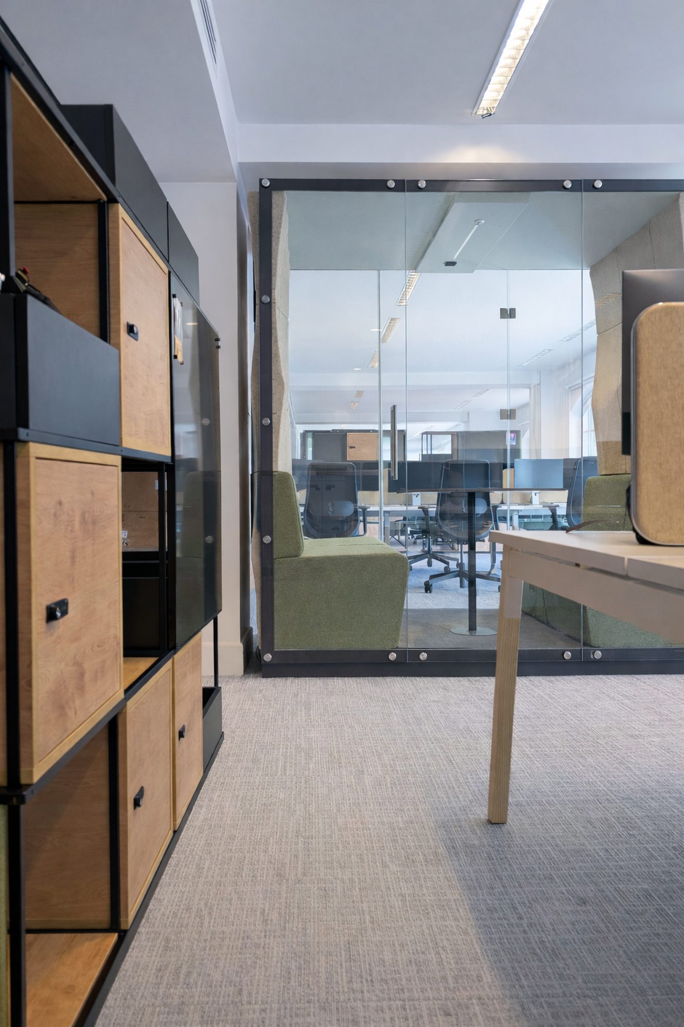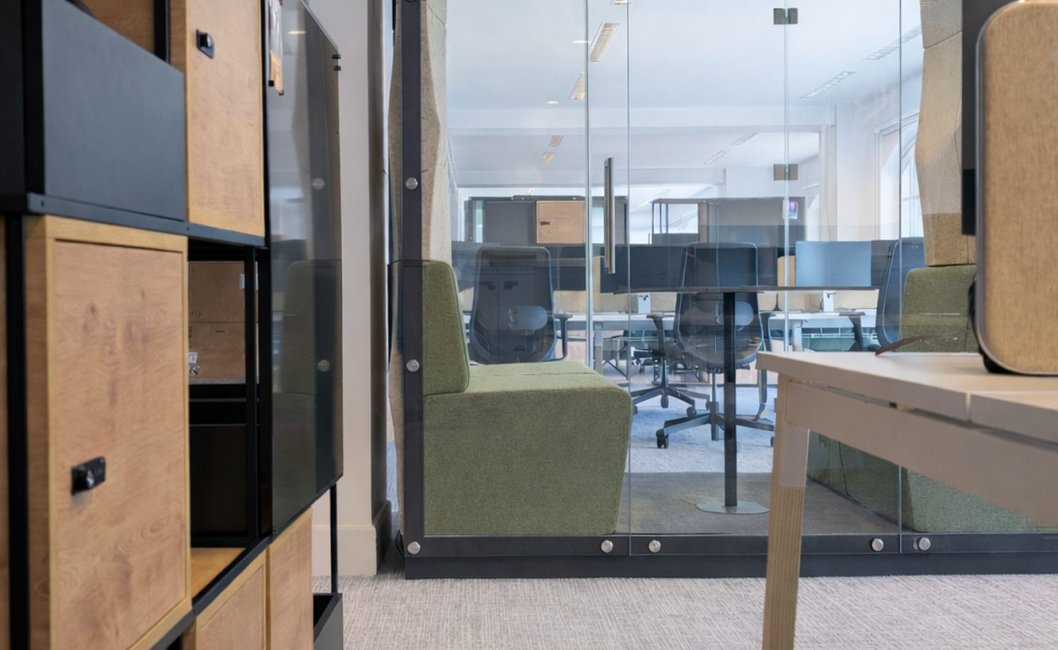 - Strefy cichej pracy i spotkań: w biurze pojawiły się 4 kabiny akustyczne z linii VANK_ELLIPSE w wersjach 1-, 2- oraz 3-osobowej. Boksy akustyczne VANK definiują strefy pracy indywidualnej i spotkań. Przeszklenia zachowują dostęp światła dziennego, a naturalne włókna lnu i konopi ocieplają przestrzeń wizualnie i akustycznie.