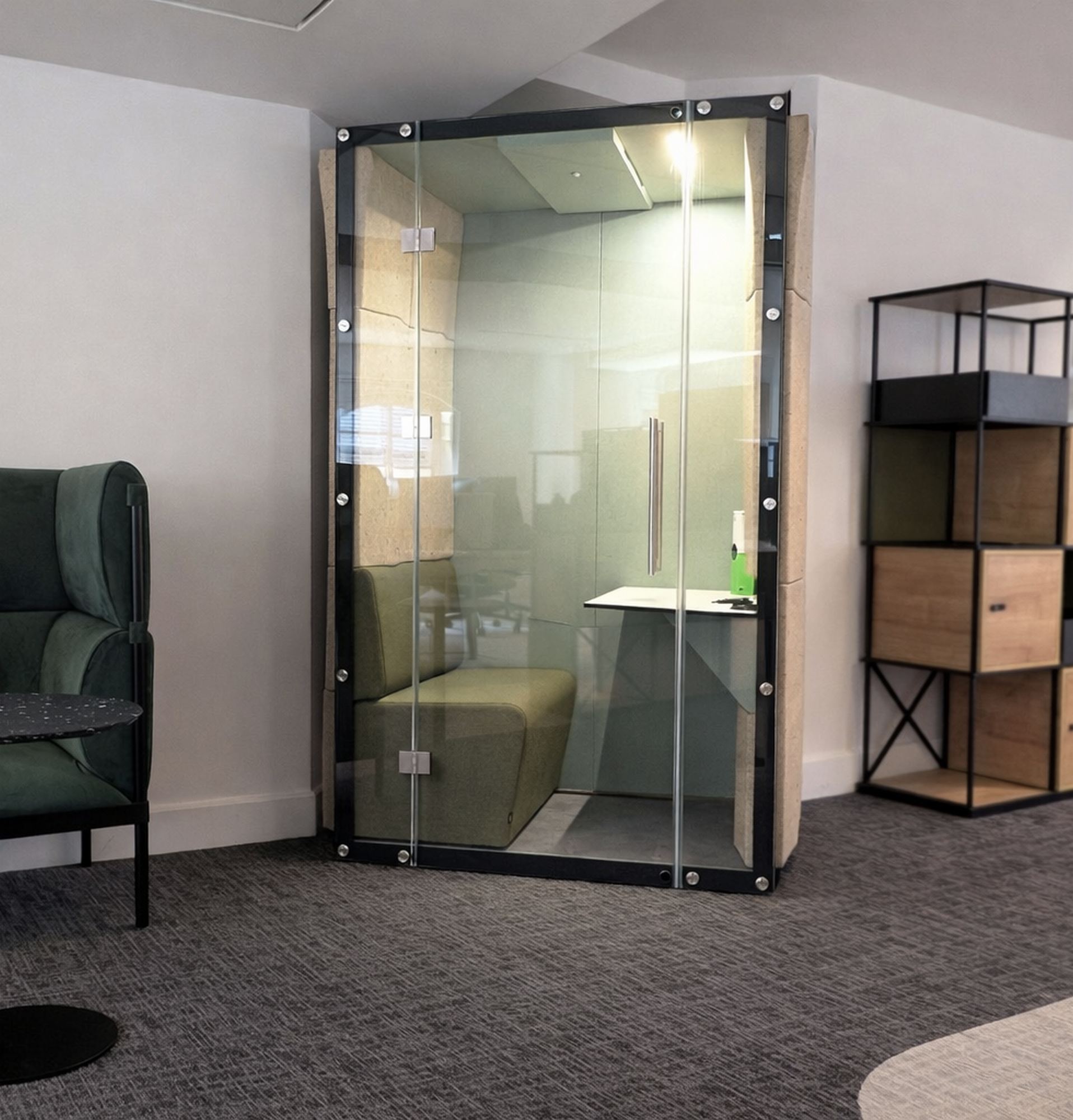 - Wbudowane wyposażenie: każdy z boksów posiada zintegrowane wyposażenie wewnętrzne – wygodne, tapicerowane siedziska oraz stolik, co czyni je w pełni gotowymi do pracy stanowiskami.
