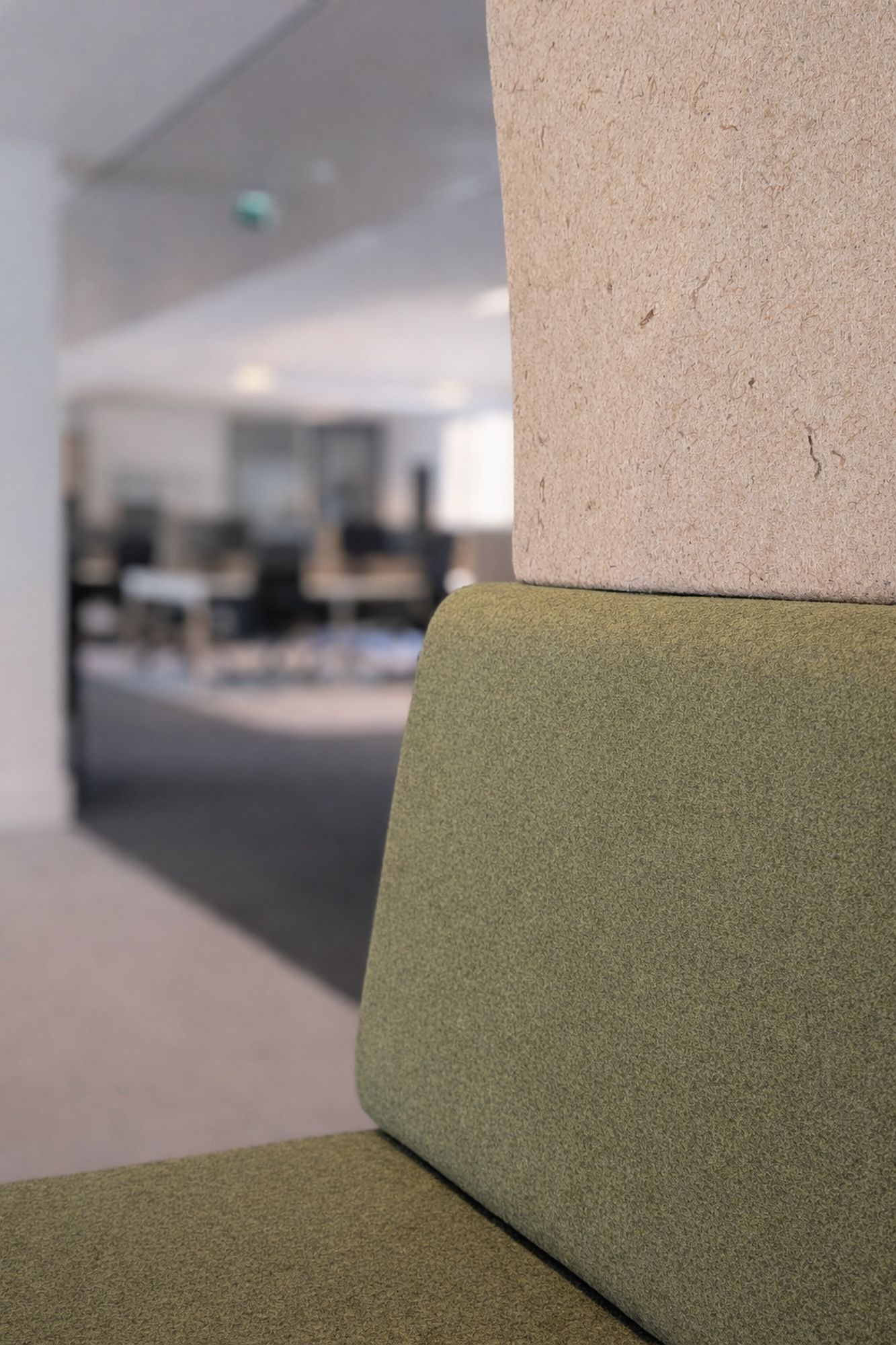 Realizacja „pod dachami Paryża” to przykład biura, które dba o dobrostan. Zastosowane materiały z linii BIO, oparte na surowcach odnawialnych (len i konopie), wpisują się w strategię zrównoważonego rozwoju klienta. Stonowana kolorystyka tapicerek w odcieniach zieleni i beżu, w połączeniu z drewnianymi detalami, stworzyła spójną, kojącą całość.