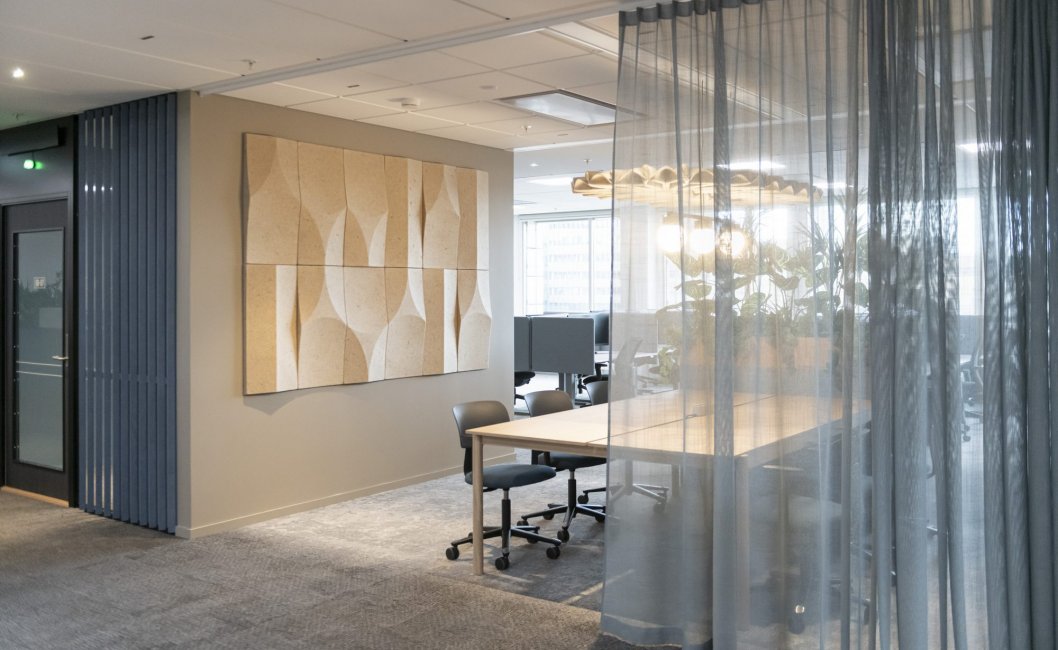 - Kluczowe przestrzenie zostały wyposażone w panele akustyczne VANK_ELLIPSE BIO LIGHT