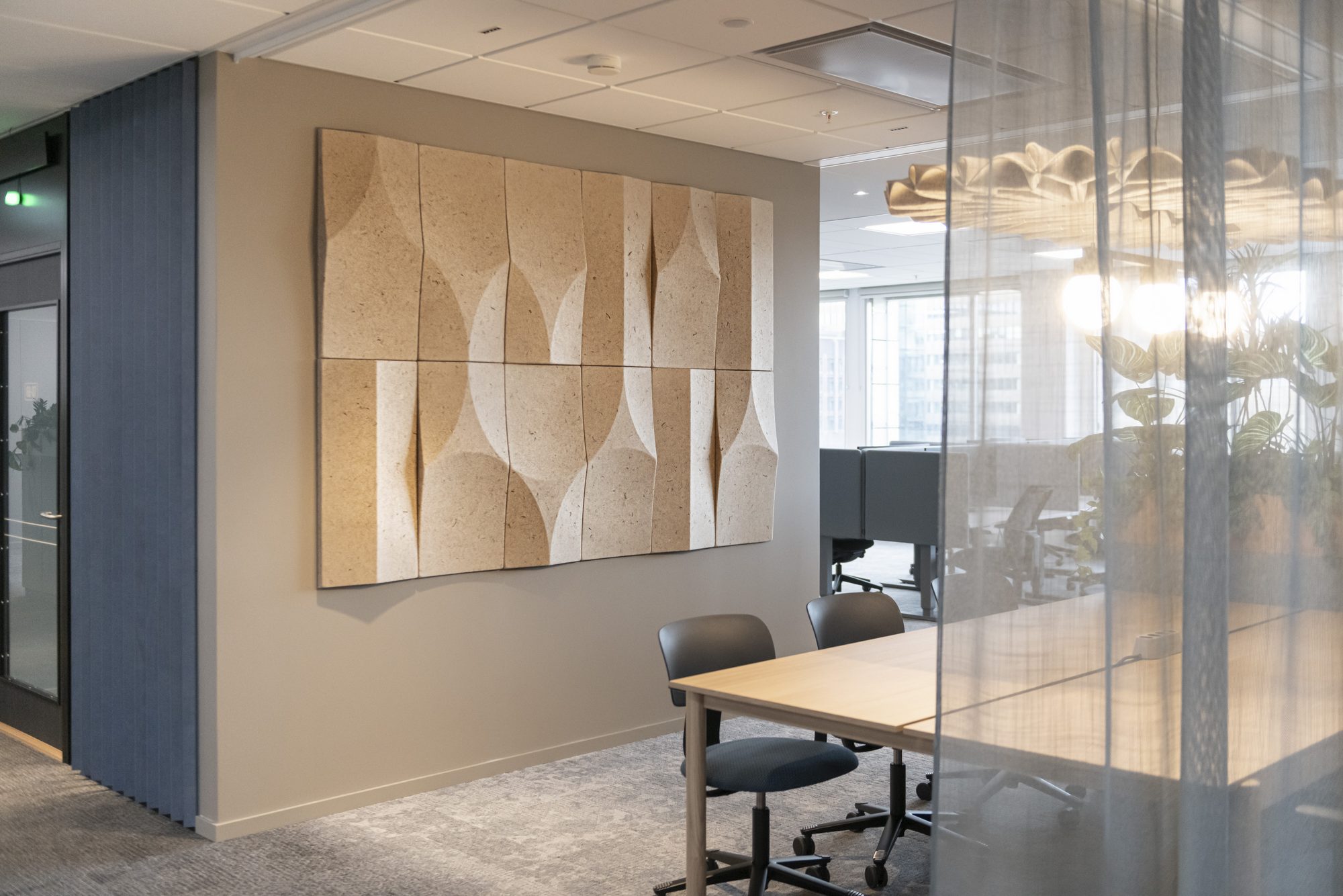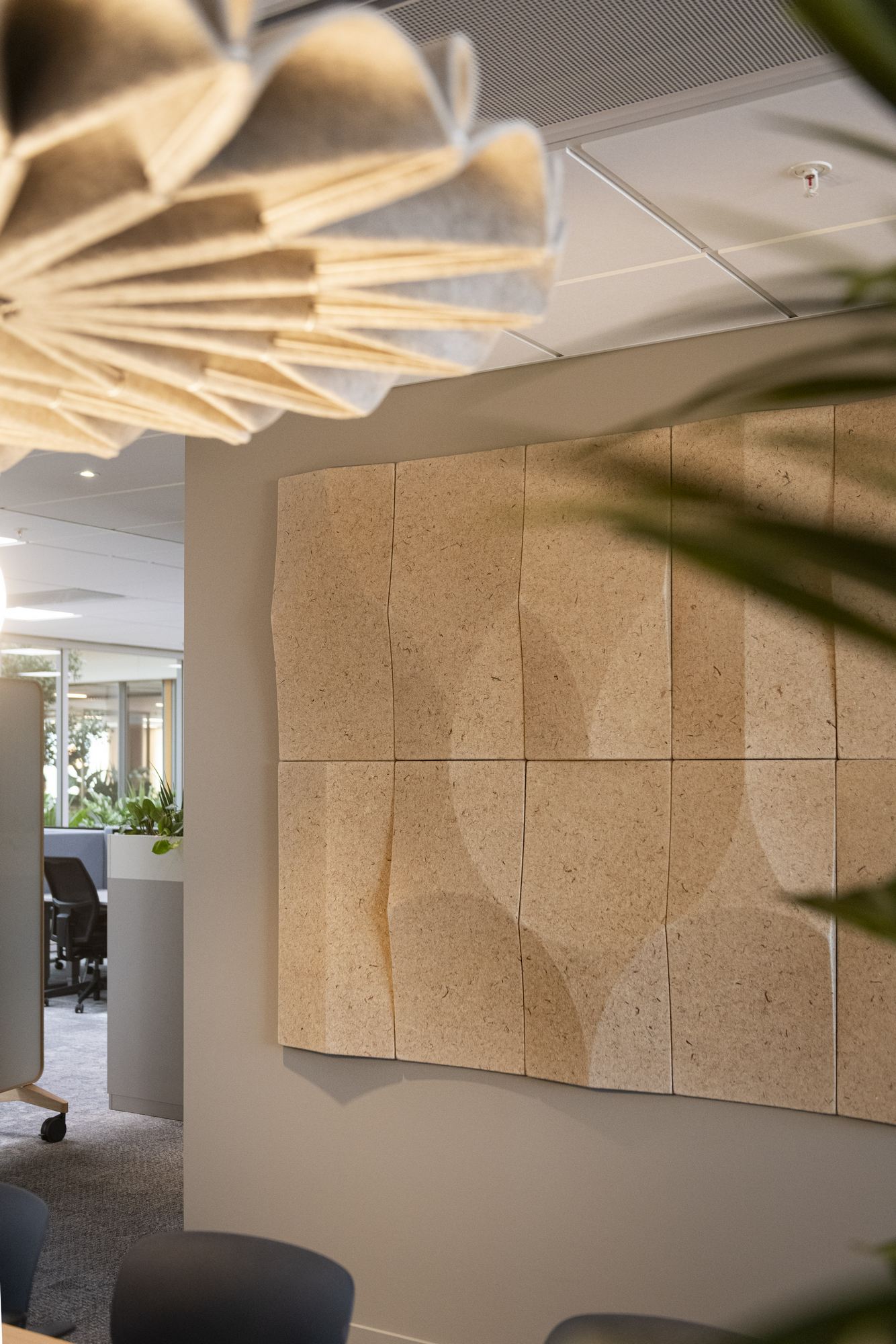 Panele zostały rozmieszczone w kluczowych miejscach: wzdłuż osi komunikacyjnych, w strefach pracy oraz w przestrzeniach przejściowych. Wykorzystano je jako akustyczne kompozycje ścienne – trójwymiarowe instalacje, które wprowadzają do wnętrza rytm, wyciszenie i architektoniczny wyraz.
