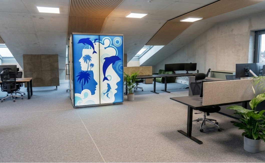 - Das zentrale Element ist eine 4-Personen-Akustikbox VANK_BOX GRAPHIC LIGHT, die für Telefonate und kleine Meetings genutzt wird und akustische Abschirmung bietet.