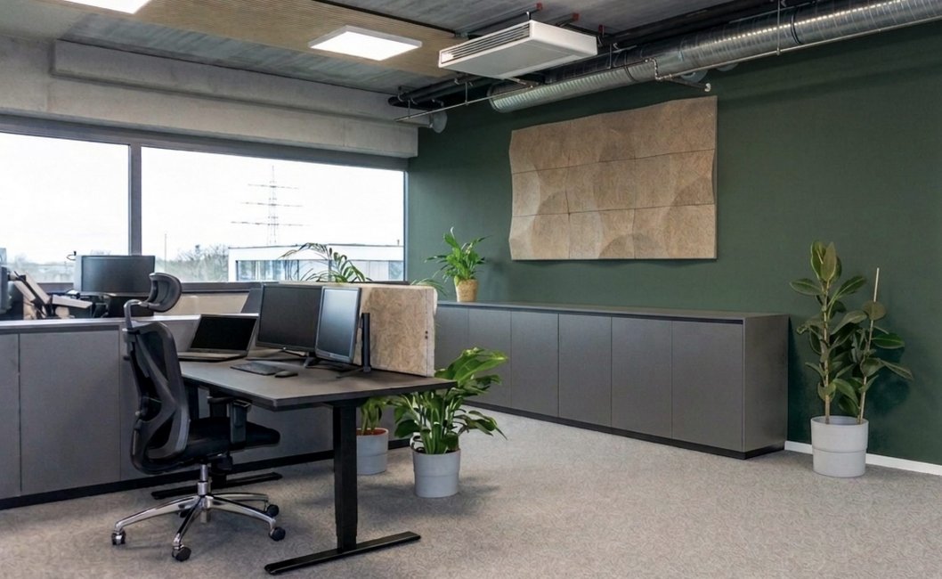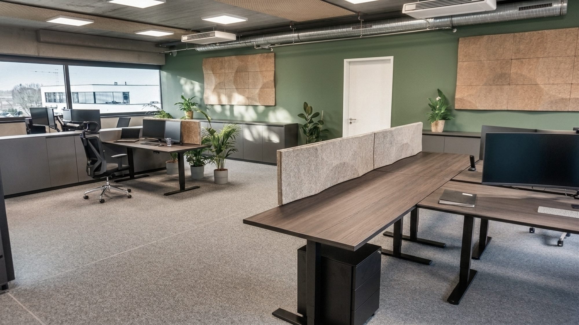 - Der offene Charakter des Büros bleibt erhalten, wird jedoch akustisch und funktional strukturiert.