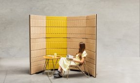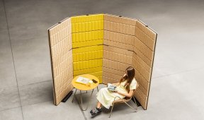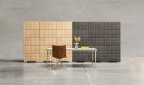 VANK_FLIP can be connected in a straight line, at 90° or 135° angles, and configured in two heights with two base types – a steel base on braked castors or a plywood base with concealed castors. Rotating panels allow users to open selected fragments of the wall, creating transparent sections that let more light through. Thanks to the rotating panels, users can control their level of accessibility by opening or closing individual panels, creating window-like openings in the wall. Additional functionality comes with hanging shelves that can be integrated into the screens.