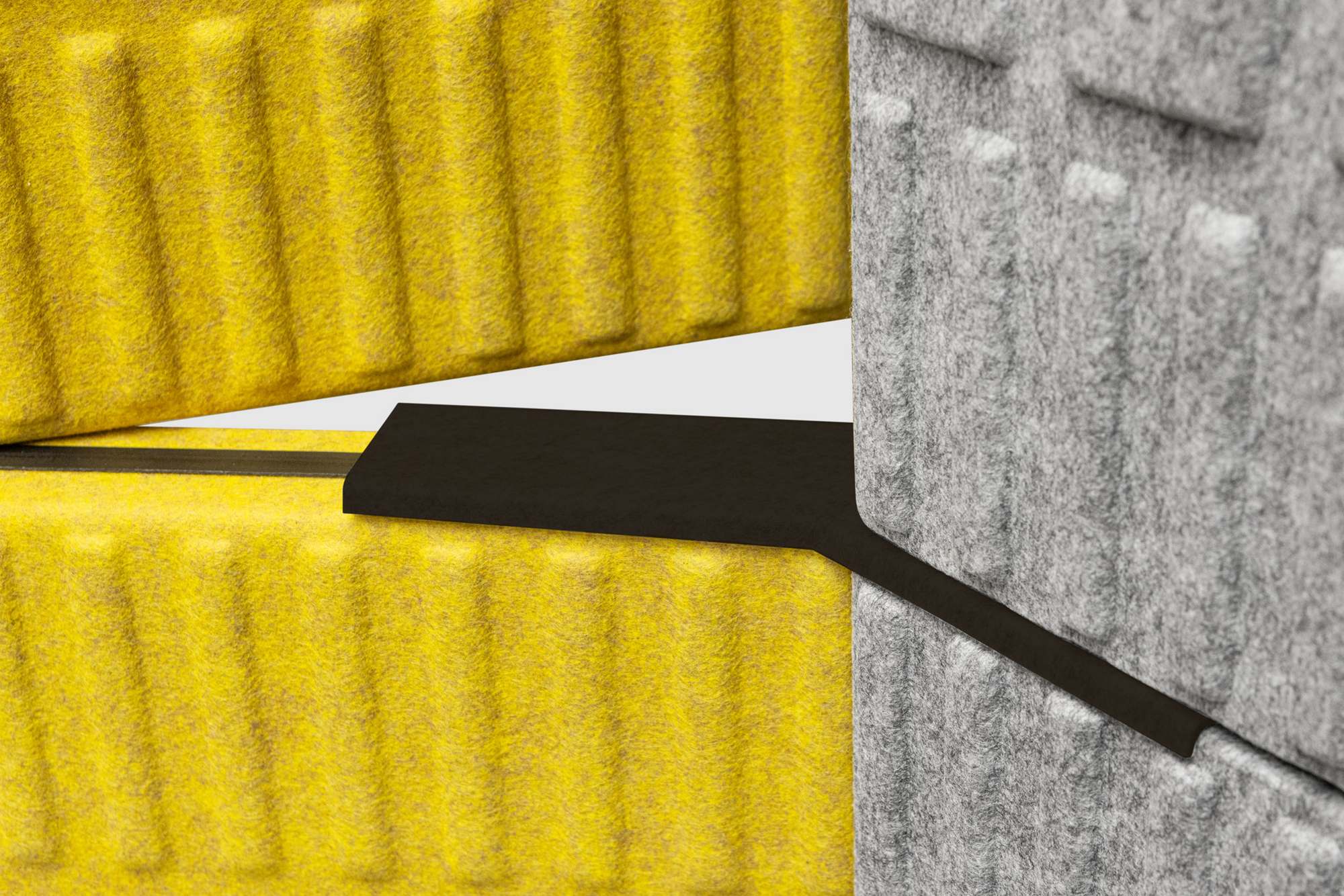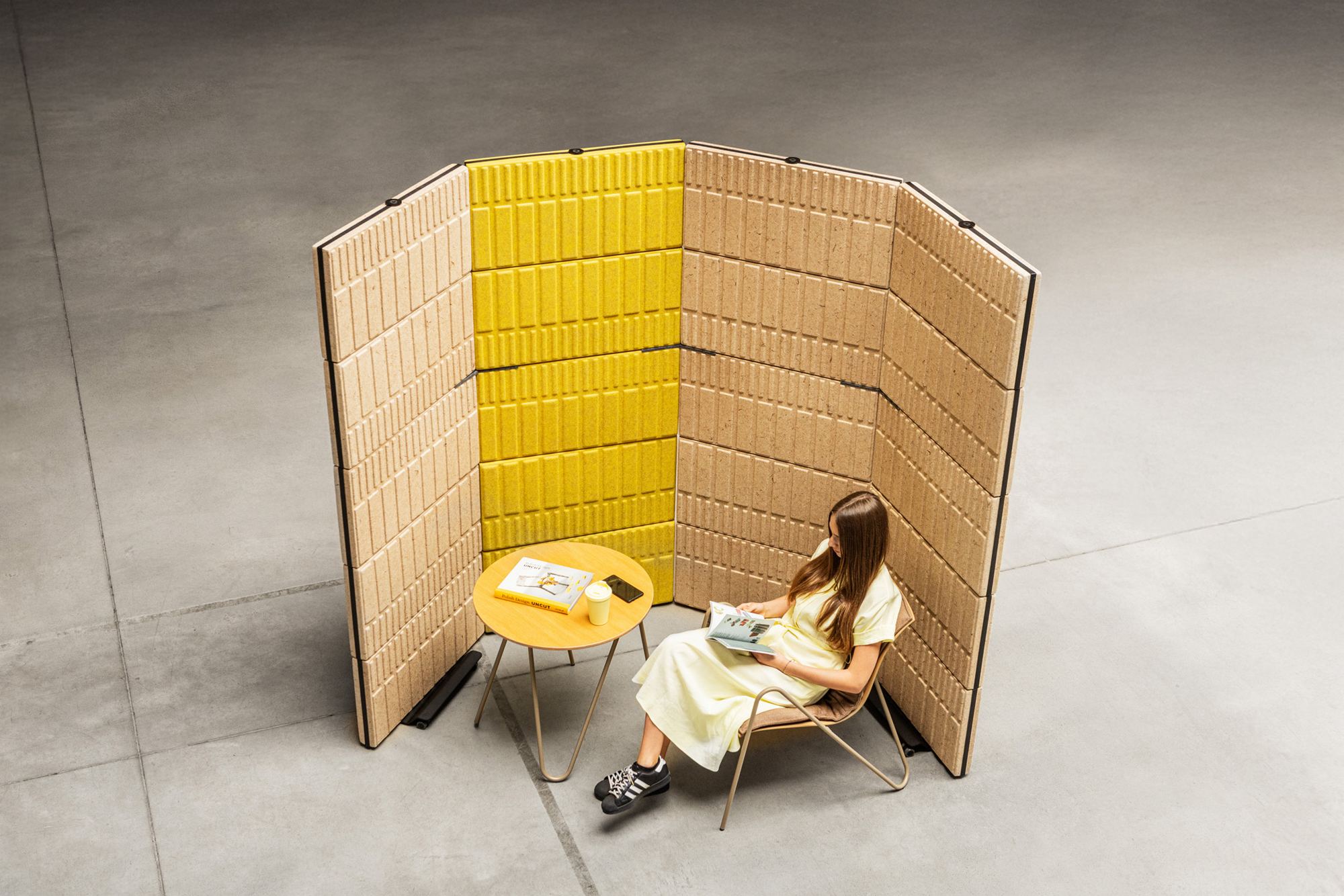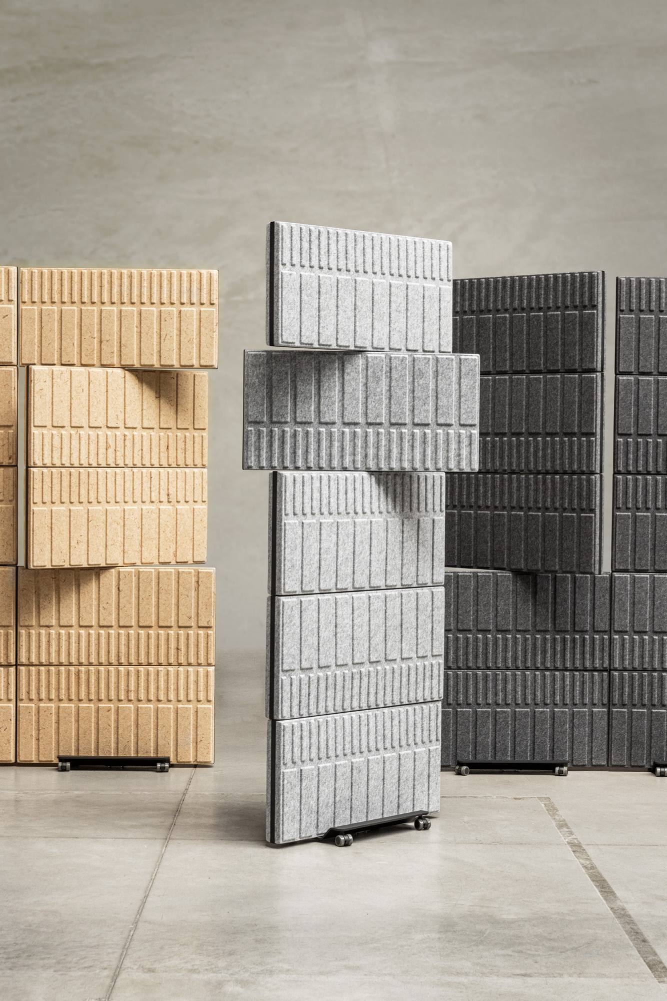 Their signature feature are the three-dimensional BRICKS panels, inspired by the form of building bricks, which not only bring a bold architectural character but also deliver excellent acoustic performance (αw = 0.90). Panels are available in three material versions: biocomposite (flax and hemp), recycled rPET, or upholstered in a selected fabric