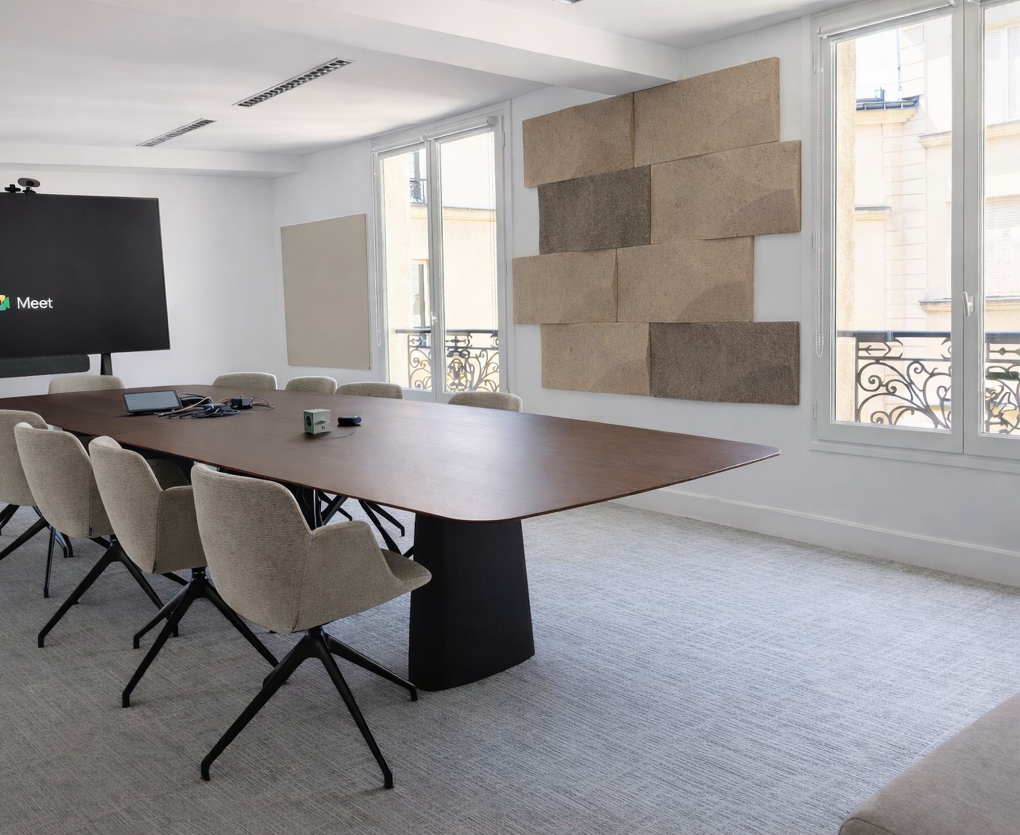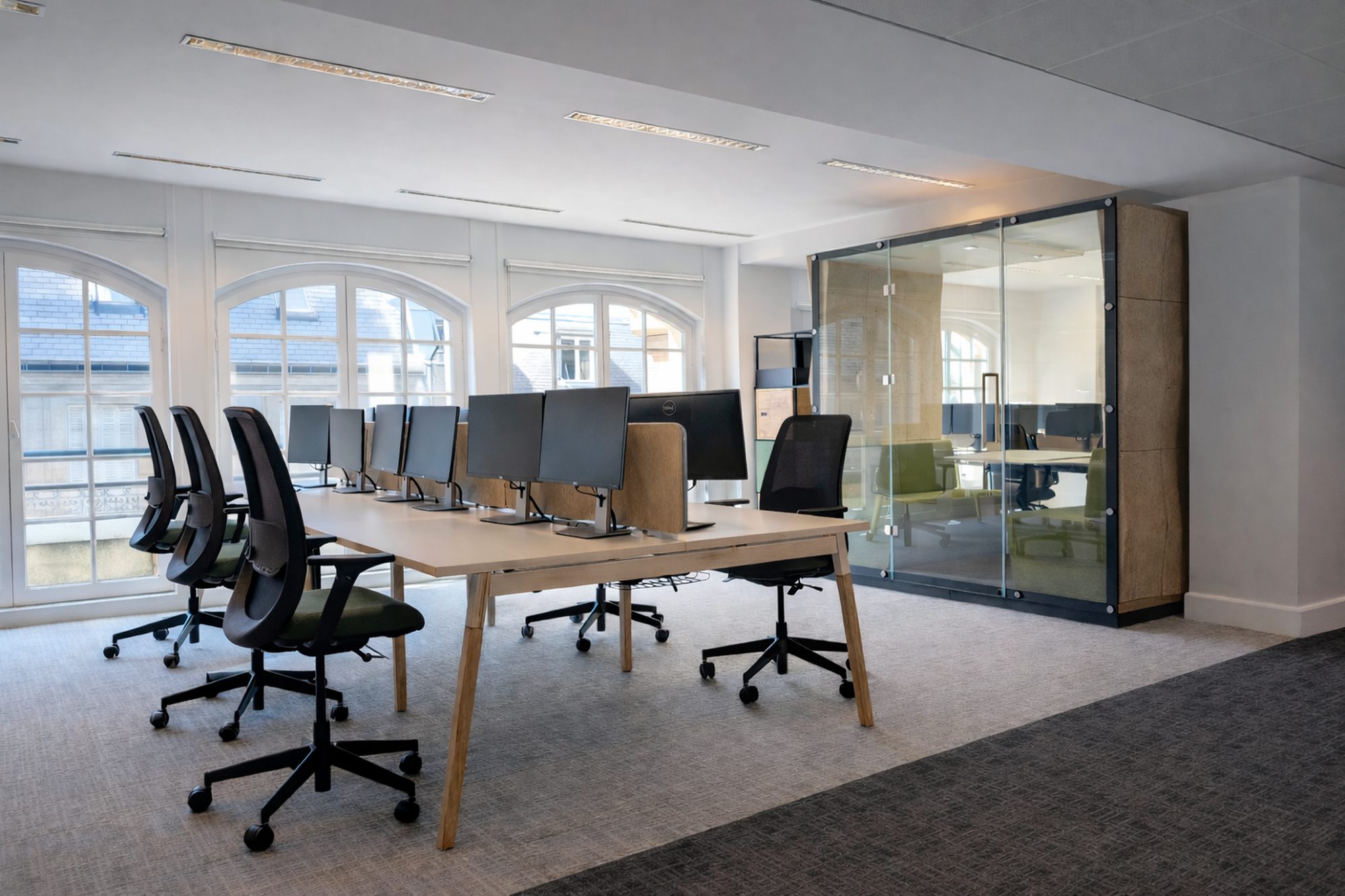 Realizacja projektu w historycznej kamienicy haussmannowskiej niosła ze sobą specyficzne wyzwania architektoniczne. Przestrzeń pod dachami Paryża charakteryzuje się dużą ilością naturalnego światła i licznymi twardymi powierzchniami, co w biurze typu open space generowało problemy z pogłosem i brakiem prywatności.