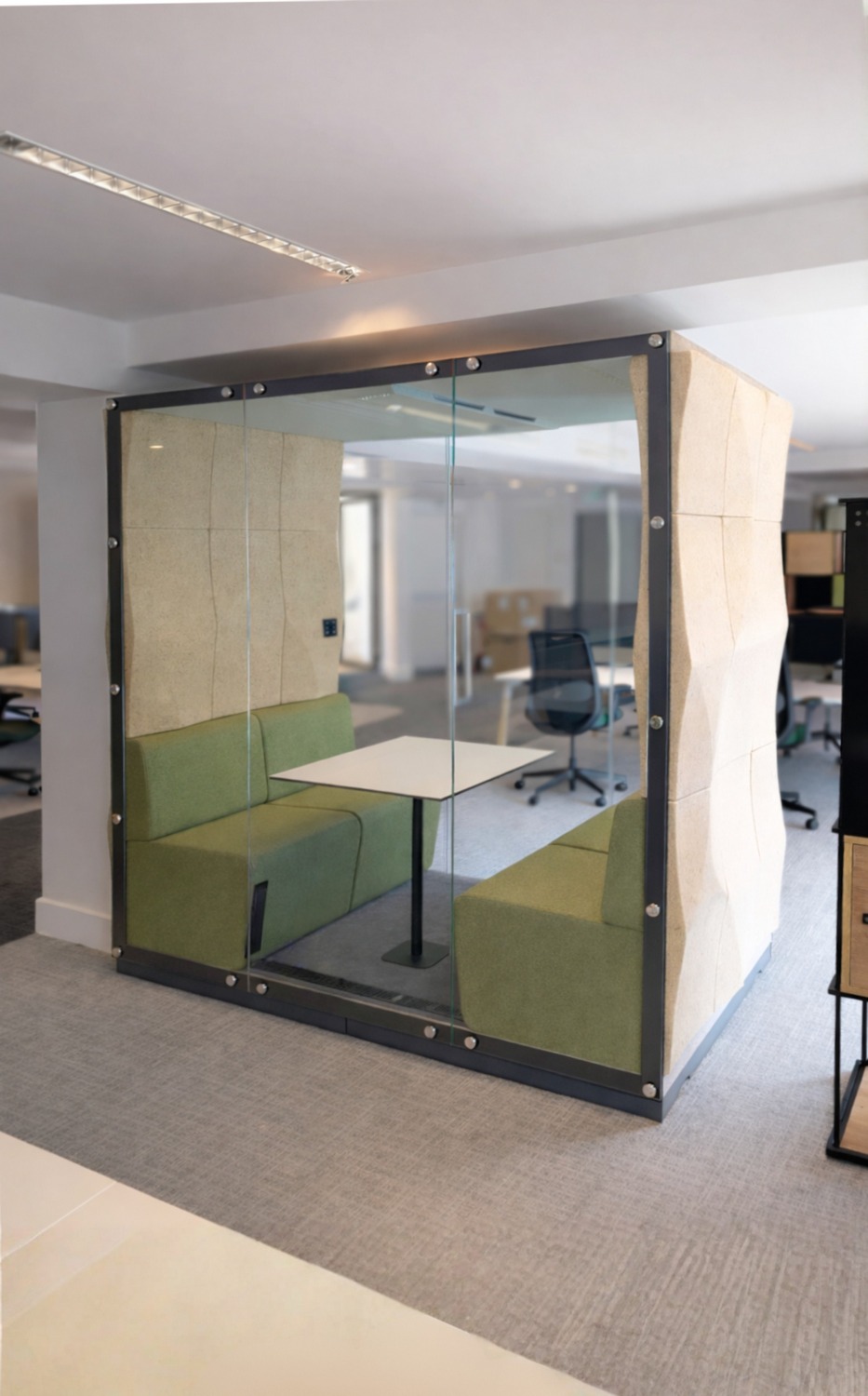 - Design i funkcja: charakterystyczne, eliptyczne kształty paneli ścian zewnętrznych budek nawiązują do kolistych form i idealnie korespondują z miękkim światłem wpadającym przez łukowe okna, tworząc w biurze intymne „wyspy ciszy”.