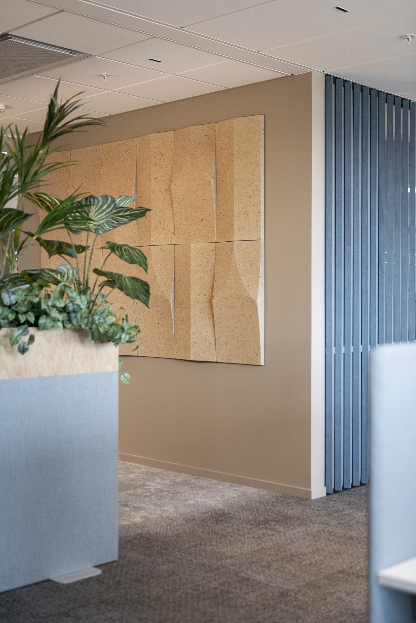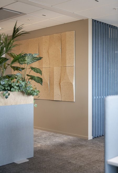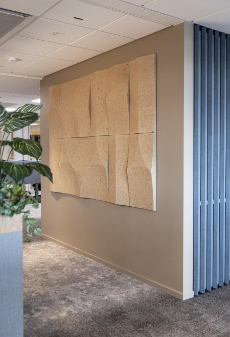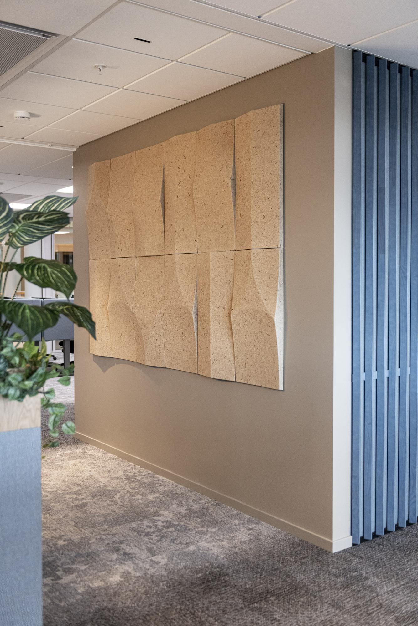 Panele zostały rozmieszczone w kluczowych miejscach: wzdłuż osi komunikacyjnych, w strefach pracy oraz w przestrzeniach przejściowych. Wykorzystano je jako akustyczne kompozycje ścienne – trójwymiarowe instalacje, które wprowadzają do wnętrza rytm, wyciszenie i architektoniczny wyraz.