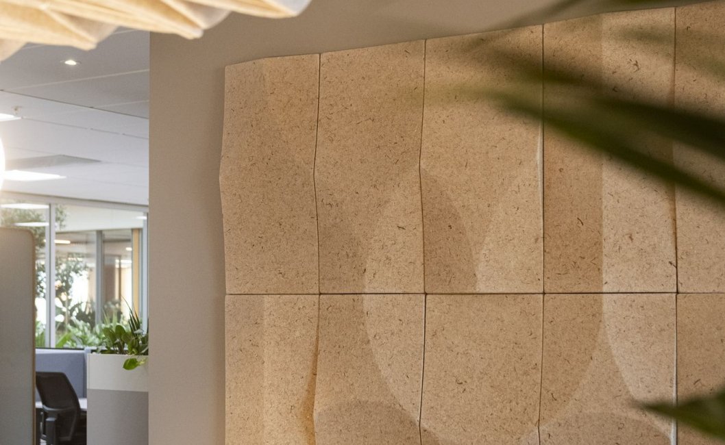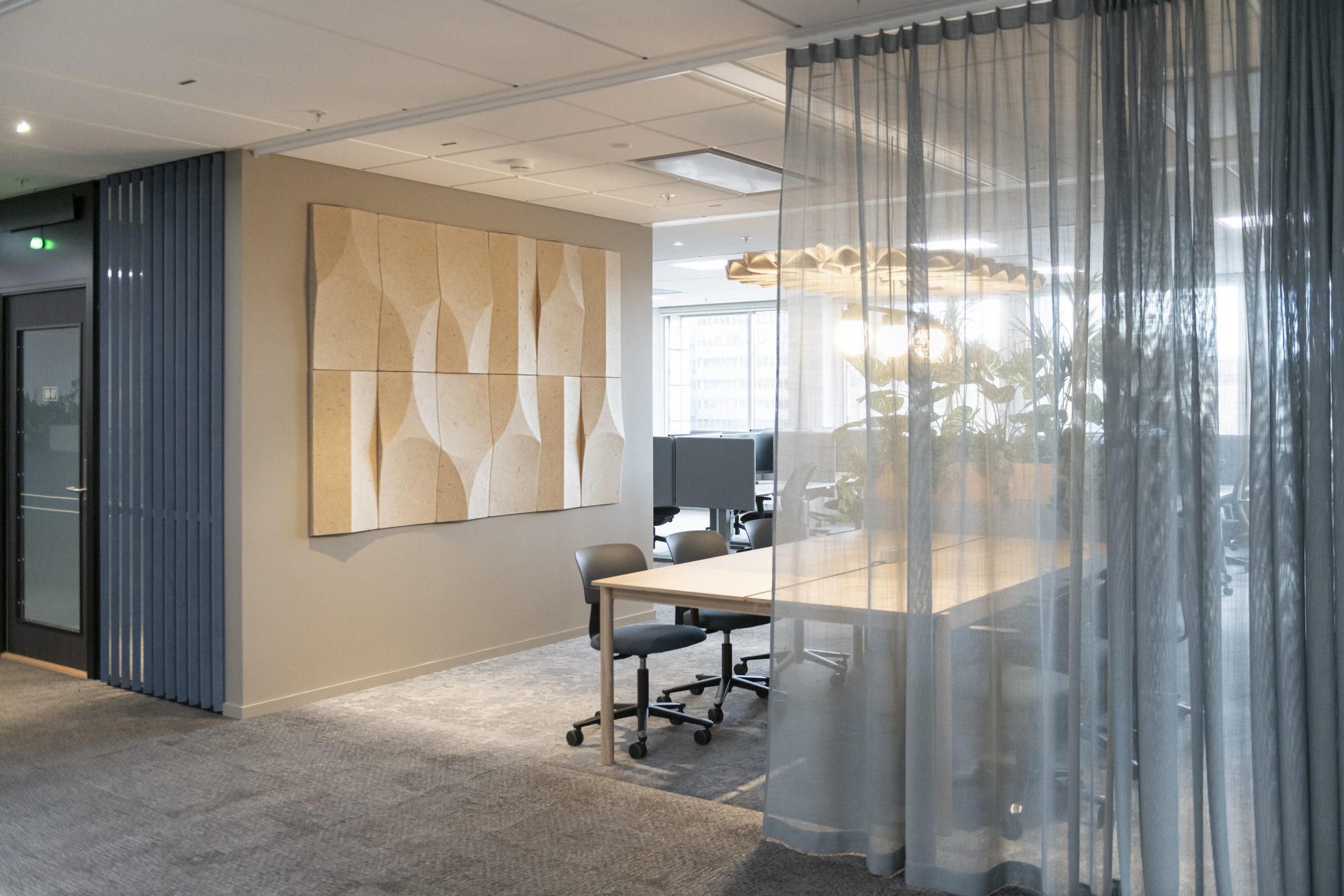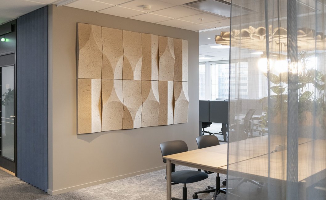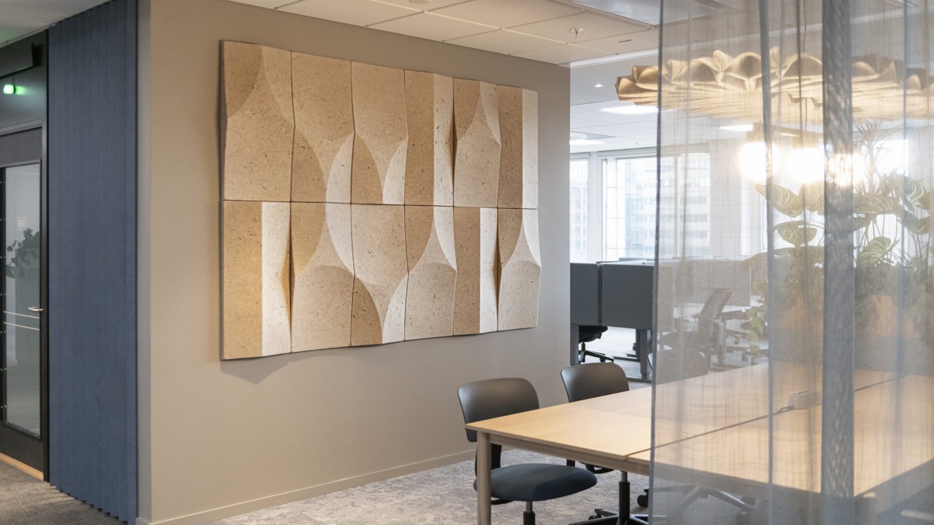 Panele zostały rozmieszczone w kluczowych miejscach: wzdłuż osi komunikacyjnych, w strefach pracy oraz w przestrzeniach przejściowych. Wykorzystano je jako akustyczne kompozycje ścienne – trójwymiarowe instalacje, które wprowadzają do wnętrza rytm, wyciszenie i architektoniczny wyraz.